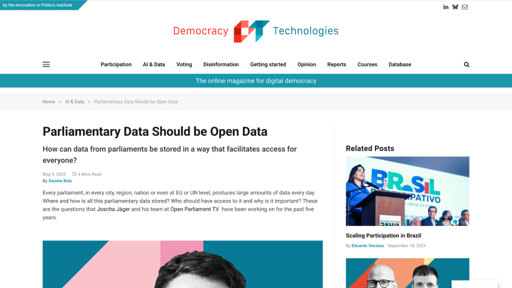 The Democracy Technologies magazine has published an article about Open Parliament TV. In “Parliamentary Data Should be Open Data”, author Souwie Buis explores the vision behind the project and describes how linking audiovisual recordings, stenographic transcripts, and enrichment data from Wikipedia and Wikidata can make parliamentary debates more transparent and accessible to citizens. The article also discusses the challenges of working with parliamentary data, from outdated data management systems to the lack of standardized, openly licensed data production.