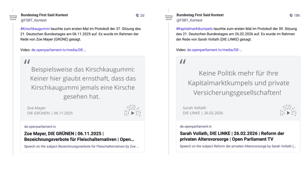 The Bundestag First Said bot posts words that are said in the German Bundestag for the first time. Technically, the update works by identifying a sentence that contains the word from text data available in Open Parliament TV. A URL is then built from timing information (start/end) and a fragment parameter to address the quote precisely and trigger Open Parliament TV to automatically generate a quote card.