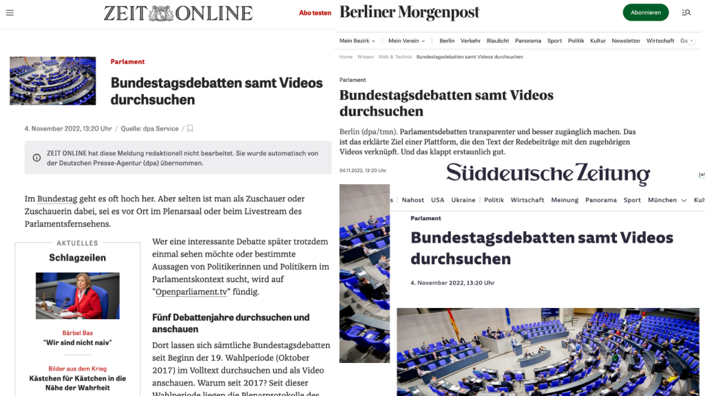 The German Press Agency (dpa) has published a report on Open Parliament TV. Via the dpa news ticker, articles about Open Parliament TV appeared nationwide in newspapers and online on news sites such as Zeit Online, Süddeutsche Zeitung, Frankfurter Rundschau, Berliner Morgenpost, LZ, NWZ Online, Saarbrücker Zeitung, Augsburger Allgemeine, Vodafone.de, RTL.de, GMX, Web.de.